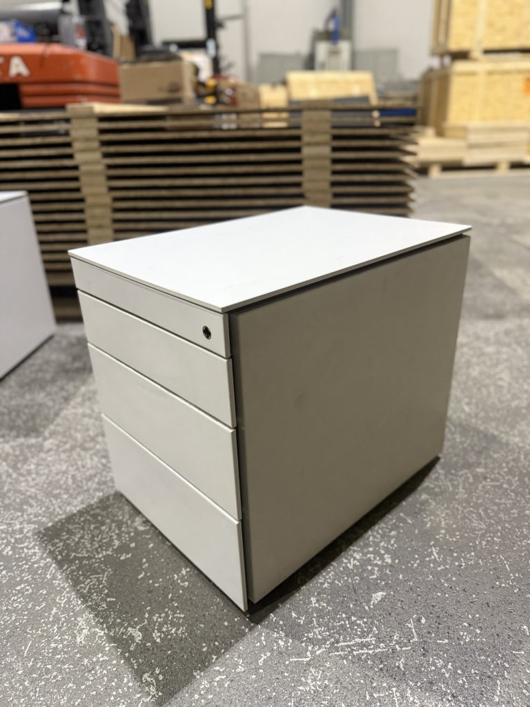 Dieses elegante Regal von USM Haller in zeitlosem Lichtgrau steht auf dezenten Füßchen und überzeugt durch eine durchdachte Fächeraufteilung: