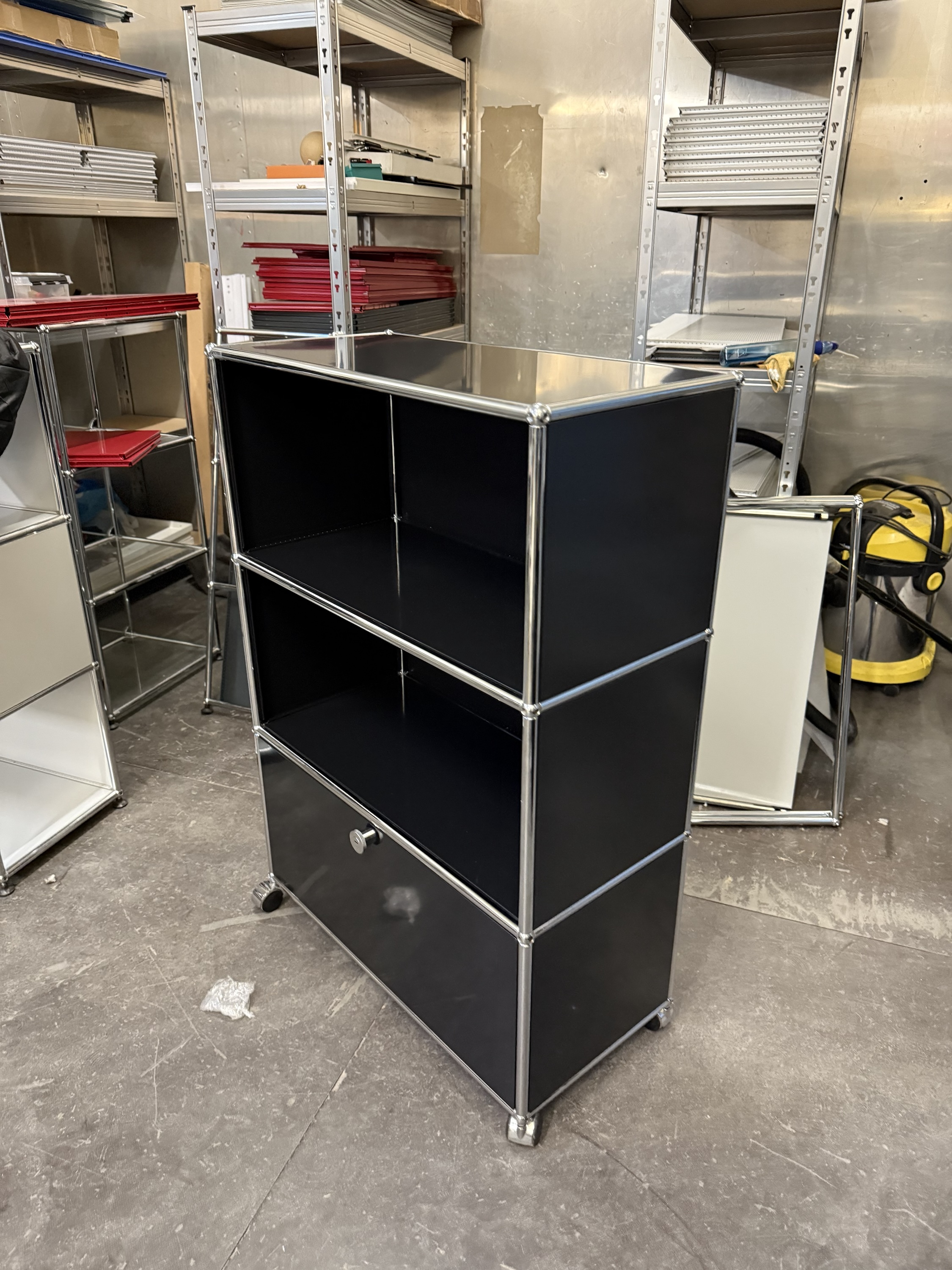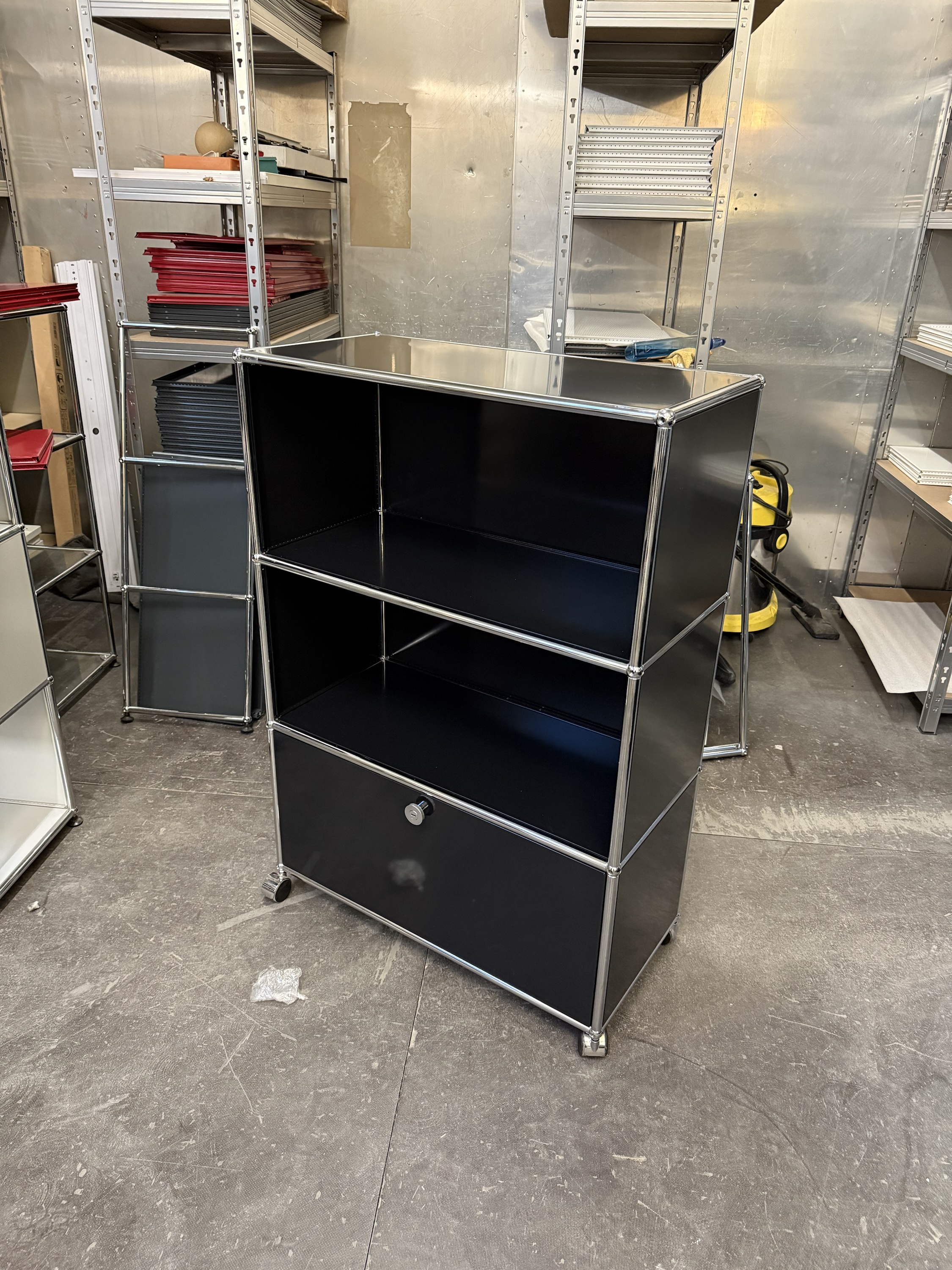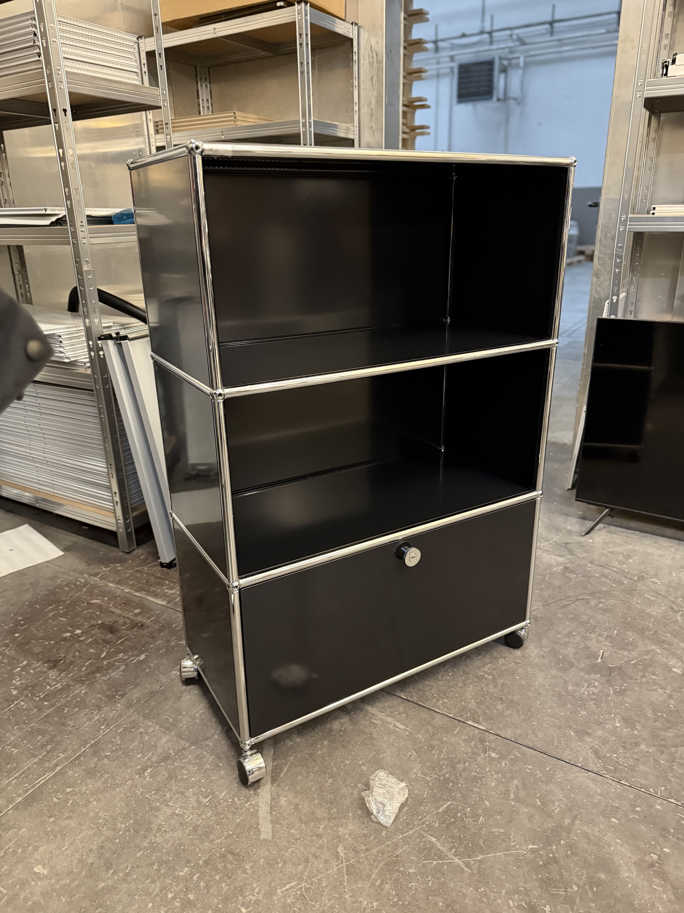 Dieses elegante Regal von USM Haller in zeitlosem Graphitschwarz steht auf dezenten Füßchen und überzeugt durch eine durchdachte Fächeraufteilung: