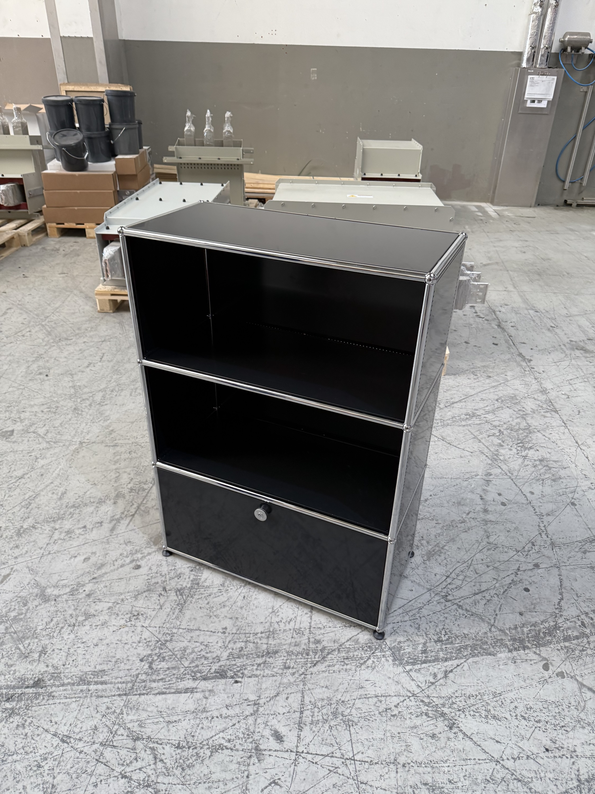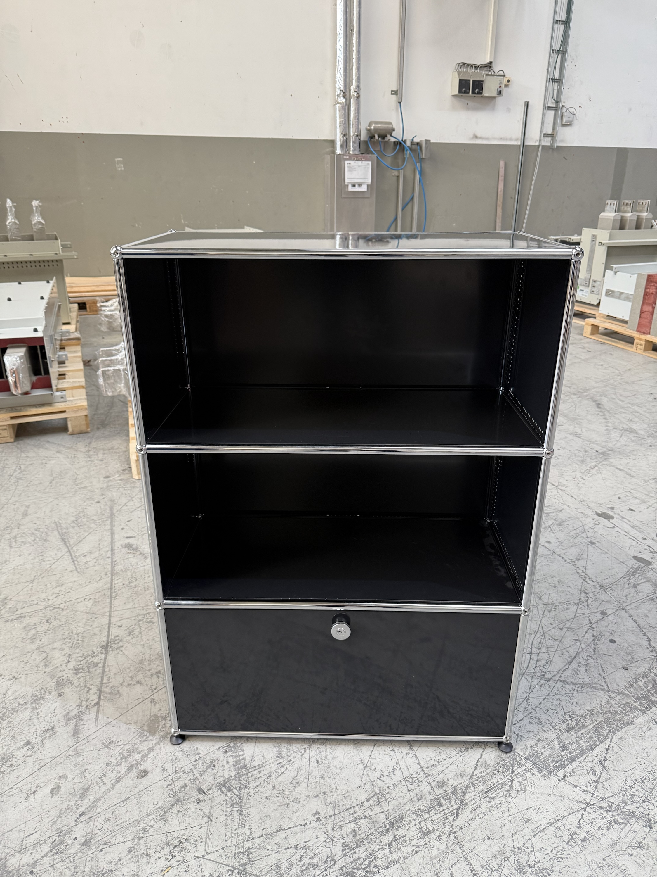 Dieses elegante Regal von USM Haller in zeitlosem Graphitschwarz steht auf dezenten Füßchen und überzeugt durch eine durchdachte Fächeraufteilung: