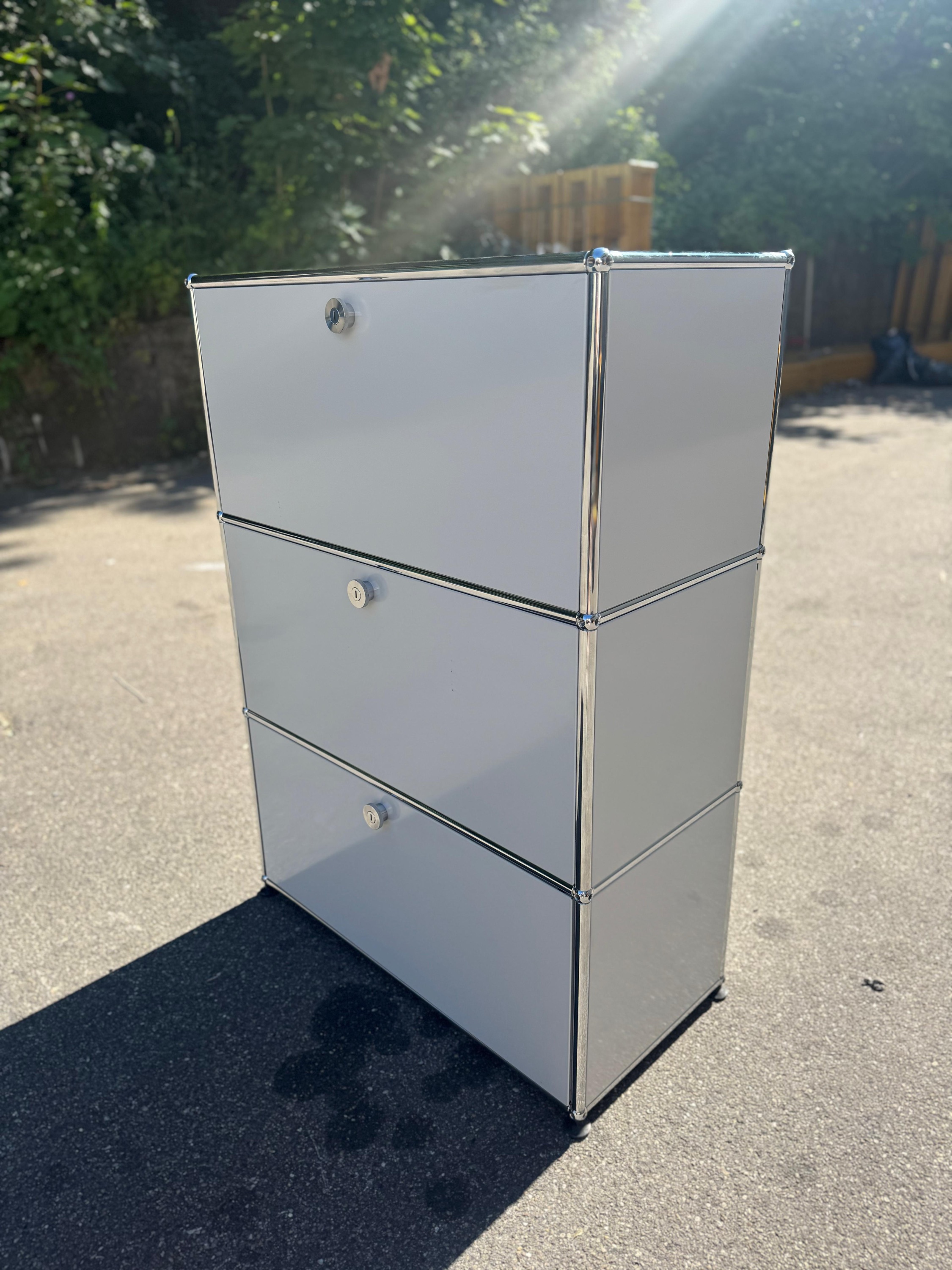 Dieses elegante Regal von USM Haller in zeitlosem Lichtgrau steht auf dezenten Füßchen und überzeugt durch eine durchdachte Fächeraufteilung: