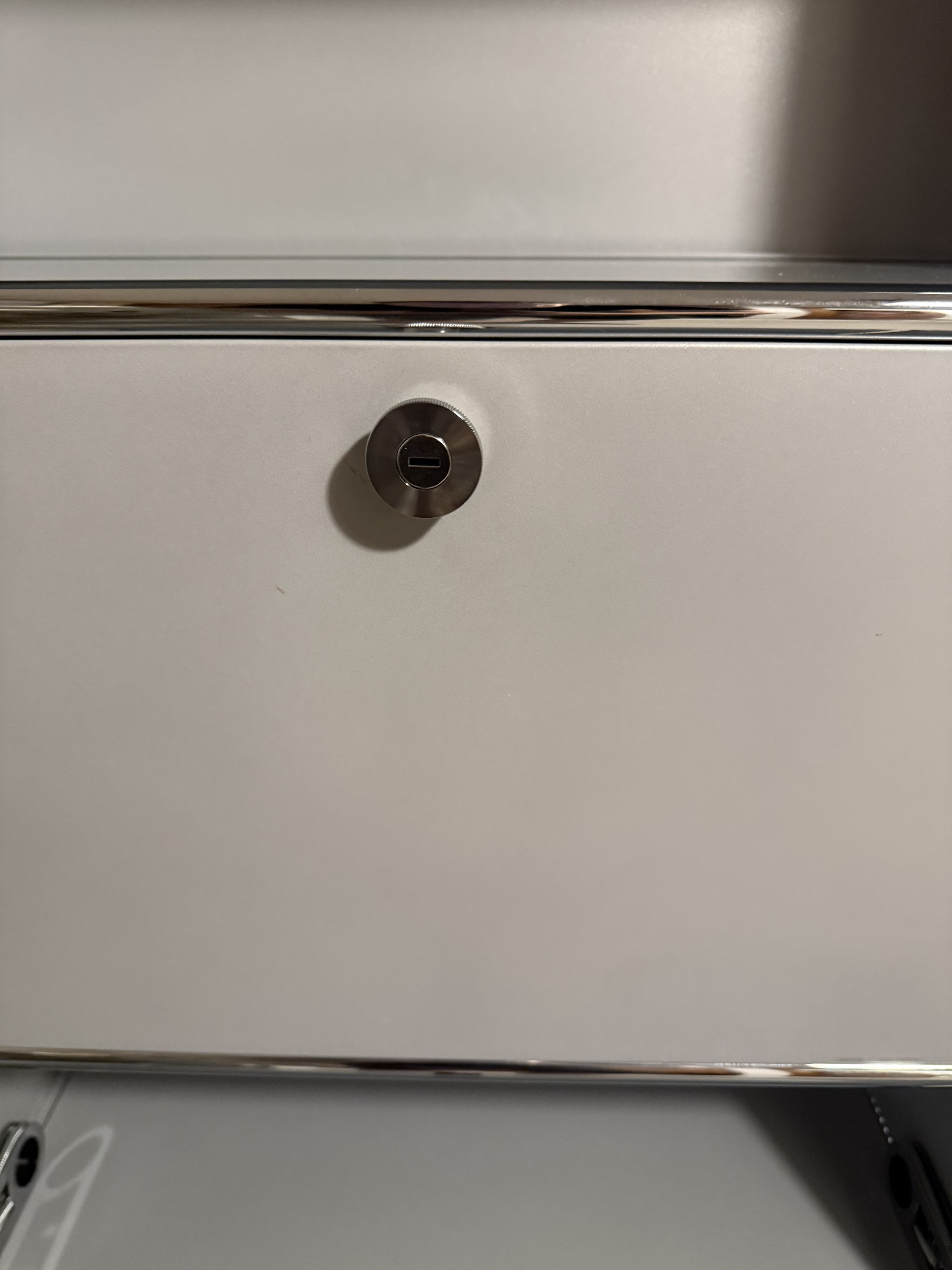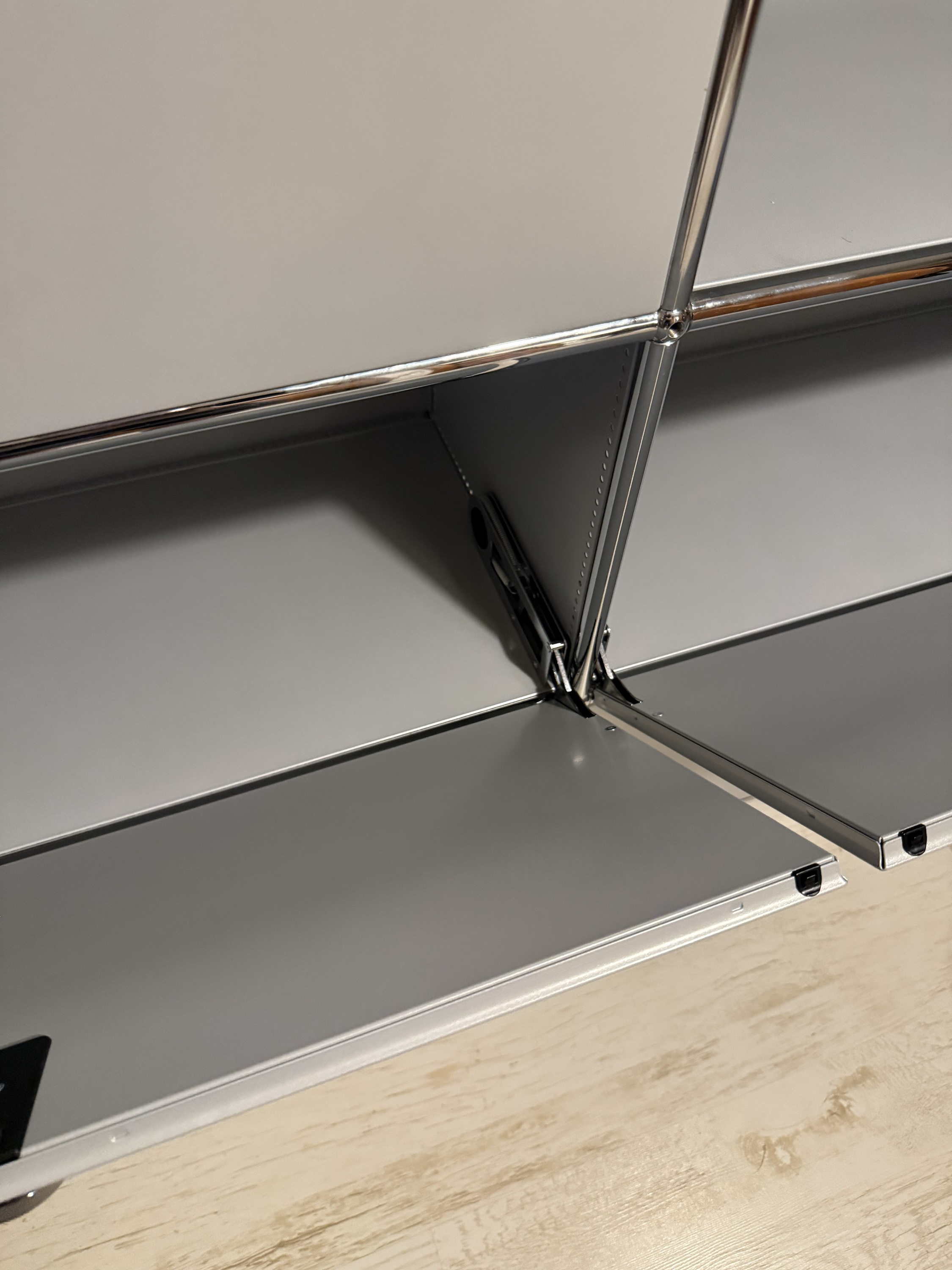Dieses elegante Regal von USM Haller in zeitlosem Mattsilber steht auf dezenten Füßchen und überzeugt durch eine durchdachte Fächeraufteilung: