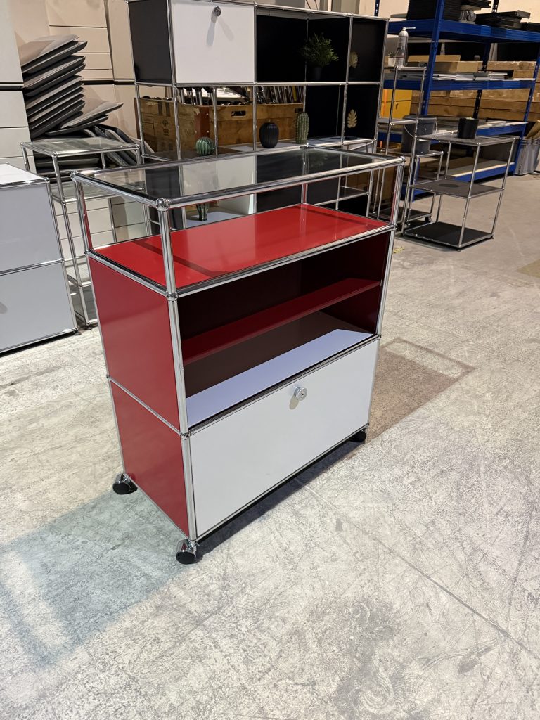 Dieses elegante Regal von USM Haller in zeitlosem Rubinrot steht auf dezenten Füßchen und überzeugt durch eine durchdachte Fächeraufteilung: