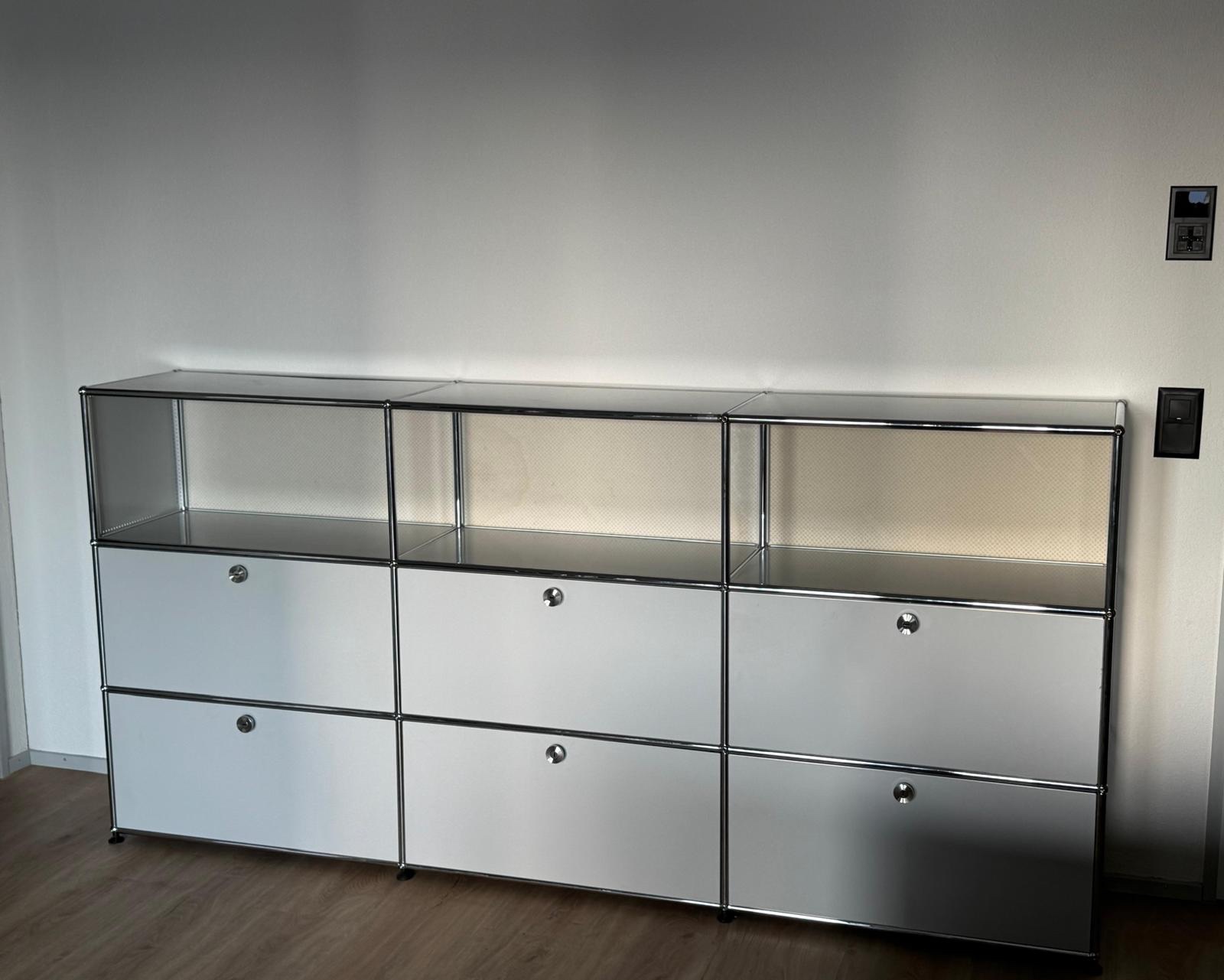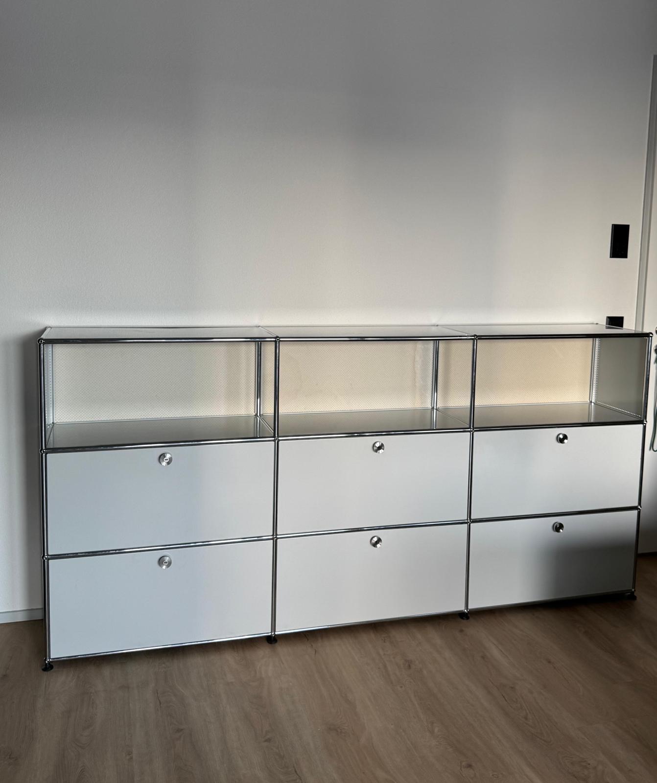 Dieses elegante Regal von USM Haller in zeitlosem Lichtgrau steht auf dezenten Füßchen und überzeugt durch eine durchdachte Fächeraufteilung: